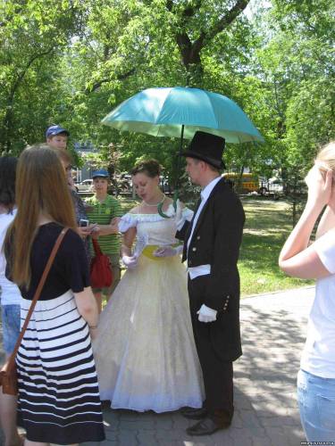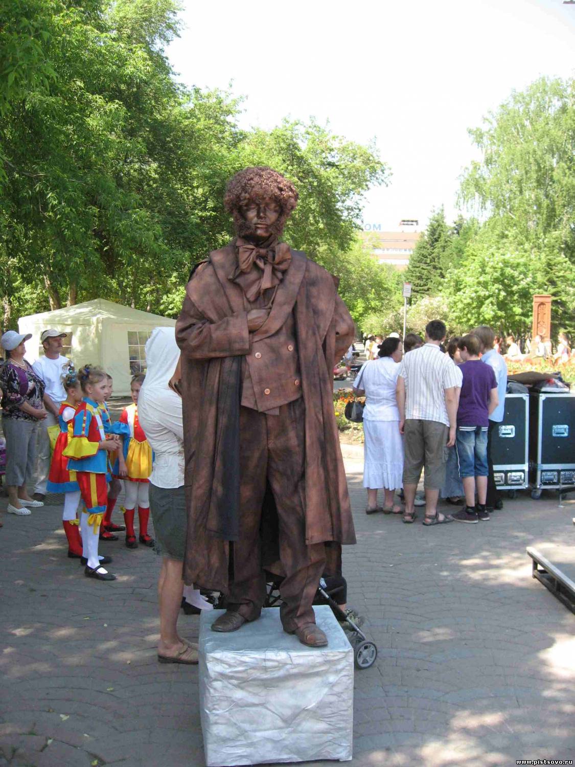 Сегодня вся страна отмечает День рождения Пушкина и у нас в сквере в центре города устроили Пушкинский Театр под открытым небом. Я решила приобщиться к этому знаменательному событию. На сцене плясали и пели маленькие «Кляксы». Рядом безмолвно замерла живая скульптура Александра Сергеевича в длинном плаще и парике, рискуя свалиться в обморок от теплового удара: ведь жара стоит 33 градуса. По дорожкам парка неторопливо прогуливались молодые пары в наряде того века. Рядом всех желающих обучали танцам времён Пушкина: мазурке и менуэту. Вечером начнется совместная читка произведений Александра Сергеевича. Запомнился ответ 7-летнией малышки, которая заявила, что она очень-очень любит Пушкина. На вопрос, где родился Александр Сергеевич, она, не задумываясь, ответила: «В Эфиопии». Хохотали все, а малышка получила приз. С каким удовольствием мы в школе разучивали наизусть это знаменитое письмо