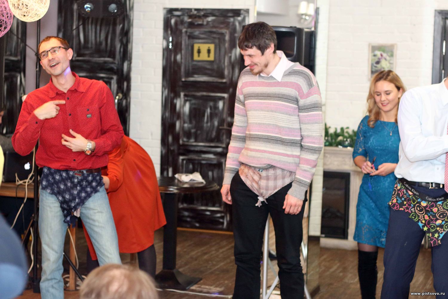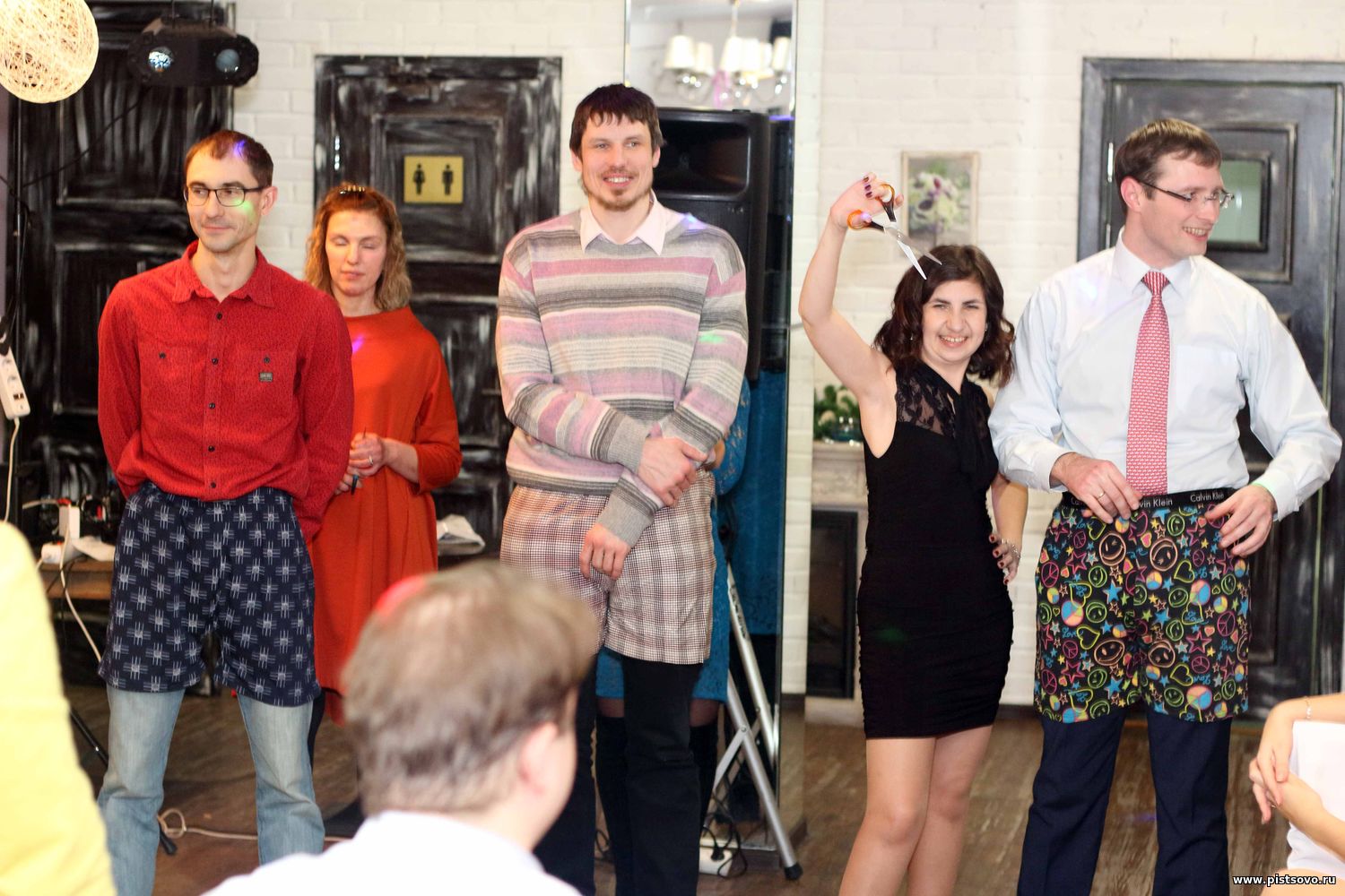 | Сегодня Старый Новый год, с чем я вас всех и поздравляю! Сижу и пересматриваю фотографии с нашего корпоратива 22 декабря. У нас вели корпоратив два парня. Они сразу предупредили, что они не знают, что получится, т.к будет сплошная импровизация. И понеслась. Вызвали Пашку Попова, нашего Деда Мороза и начался конкурс по выбору Снегурочки. Мы в это время с моей приятельницей Ритой вышли в фойе поговорить, заходим и сразу же, как куры во щи попали на этот конкурс. Меня спрашивают: «Какая у тебя была детская кличка». Я не задумываясь говорю: «Белка». Парни говорят, что эта кличка им больше всех понравилась и я пока остаюсь для участия в конкурсе. Я все-таки потихоньку ускользнула, а там дальше три девчонки, претендентки на Снегурочек, пригласили трех мальчиков, претендентов на Дедов Морозов. Им выдали семейные трусы и вьюноши надели их поверх брюк. А дальше девочкам выдали ножницы и они обкарнали прямо на этих мужских моделях семейные трусы до стрингов. Зал плакал от смеха. Самые смешные стринги были у Сашки, нашего обаяшки, потому что Натусик ему выстригла всё по минимуму. Это всё должен был оценить прошлогодний Дед Мороз, то бишь Пашка. И вот мальчики походкой от бедра двинулись к Павлу. Тут уже и Пашка хохотал. Конкурсы следовали за конкурсами и было всё так смешно, что даже уезжать домой не хотелось. Но я всё-таки вызвала такси и двинулась восвояси. На следующий день фотографии выложили в нашу общеинститутскую сеть и хохот продолжился.