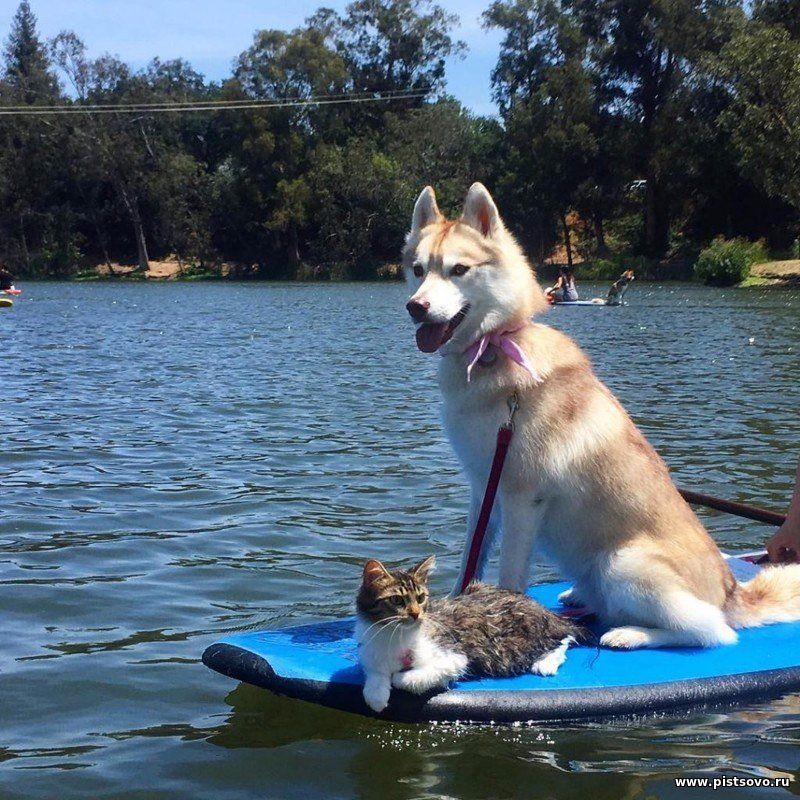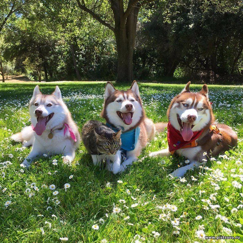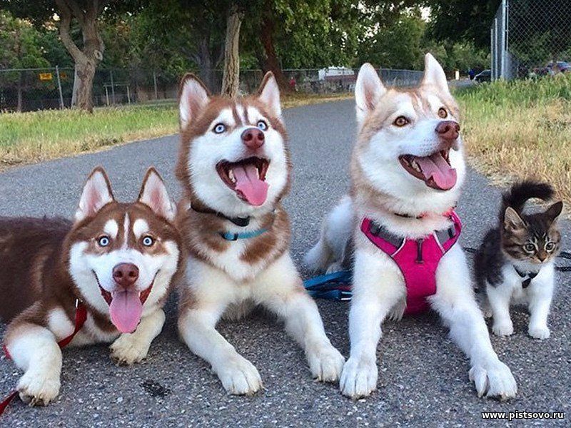 Котёнок, спасённый молодыми собаками породы хаски, немного повзрослев, считает себя главой стаи и большим, отважным псом )))