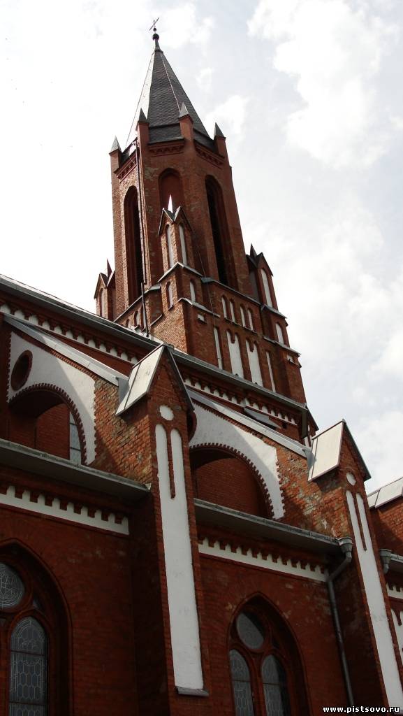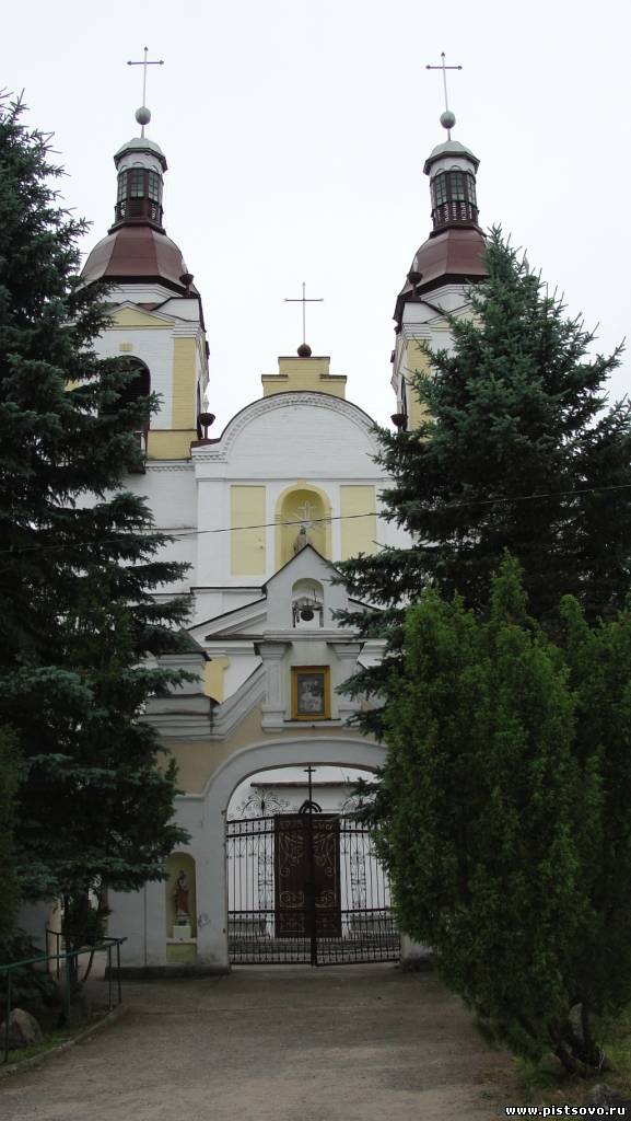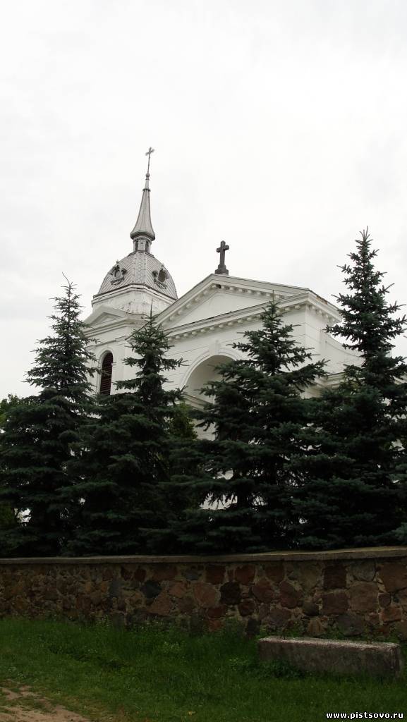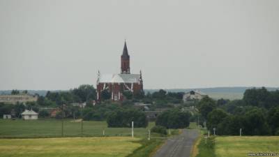 И предстала перед нами сельская идиллия: ровные поля по обе стороны дороги, красные крыши деревенских домов и красного кирпича католический костёл. Указатель ясно нам говорил: