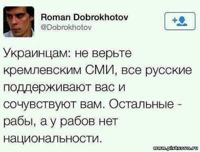 "... каждый день нам по украинскому ТВ показывают, как в России вся интеллигенция, писатели и даже артисты восстали против агрессивной политики Путина, вероломно захватившего Крым. Путин сказал Раде: "Или Янукович будет опять президентом, или Крым заберу". Твёрдо так сказал. Вроде, как ультиматум поставил. Рада не согласилась, вот он и забрал. Говорят, что в России все этим очень недовольны, того и гляди тоже, на майдан пойдут. Даже Валерий Золотухин два дня назад выступал толи по Першему, толи по Пятому каналу. Правда, не вживую говорил, а по записи. Нам только его портрет показывали. А теперь Путин собирается идти уже и на Киев".