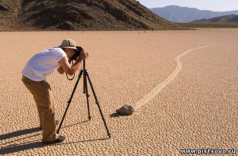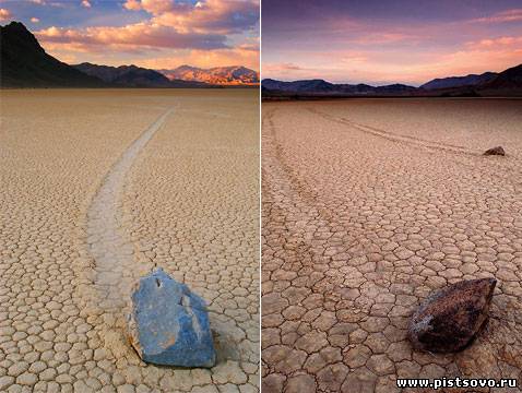 | А вот что в интернете есть про движущиеся камни. Нечто сверхъестественное творится в Калифорнии на озере Рейстрэк-Плайя . Огромные валуны сами собой ползут по дну сухого озера. К ним никто не прикасается, а они ползут и ползут. Никто не видел, как они движутся. И всё ж они упорно ползут, будто живые, изредка переворачиваясь с боку на бок, оставляя за собой следы, тянущиеся на десятки метров. Что надо этим камням? Куда они ползут? Зачем? Глинистое дно Рейстрэк-Плайя почти всё время сухое, и ничего на нём не растёт. Оно покрыто почти равномерным узором из трещин, образующих неправильные шестиугольные ячейки. На дне валяются камни — увесистые глыбы массой до тридцати килограммов. Но на самом деле они там не лежат неподвижно: временами они сами движутся, оставляя за собой на земле неглубокие (не больше пары сантиметров), но очень длинные (пока, правда, движение этих камней ещё никто не видел и не снял на плёнку). Но в том, что камни перемещаются, сомнений нет — борозды тянутся практически от каждого из них. Это не дело рук людей или иных конечностей каких-нибудь других животных. Никого за таким странным развлечением не заставали (по крайней мере, до сих пор), ибо никому эти обломки не нужны — ни людям, ни уж тем более зверям.
