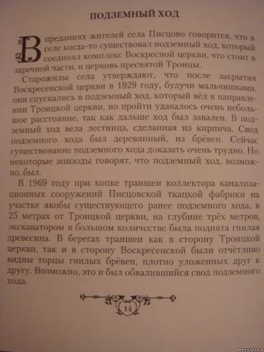 | Quote (Romashka060796) Есть про подземный ход в Писцово. Тоже очень интересно Помню, в конце 70-х - начале 80-х на подъеме дороги из Зареки к селу, справа у школьного парка, провалился трактор. Не совсем конечно, но яма была приличная. Тогда говорили, что здесь проходит подземный ход.